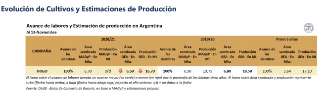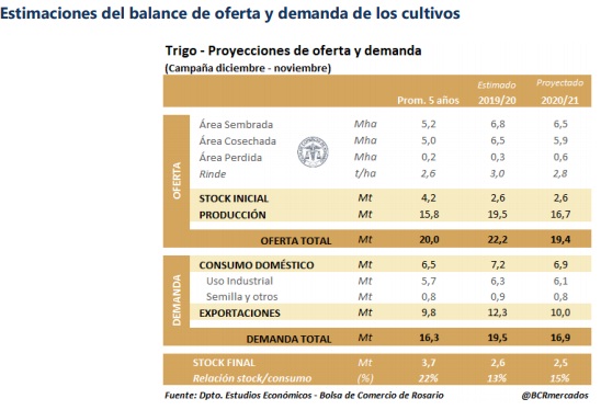 Campaña 2020/21: La falta de agua continúa descontando toneladas a la proyección de oferta de trigo para la§ próxima campaña, y la Guía Estratégica para el Agro (GEA-BCR) recortó la estimación de producción a 16,7 Mt. Contemplando un carryover menor al promedio (2,8 Mt), se aleja la posibilidad de alcanzar una oferta total superior a las 20 Mt, lo cual arrojaría el volumen más bajo de los últimos cinco años (19,5 Mt).