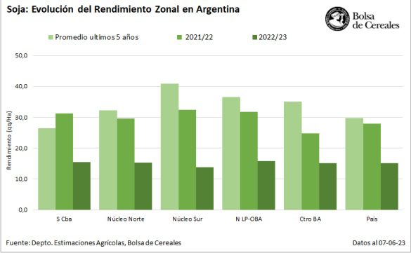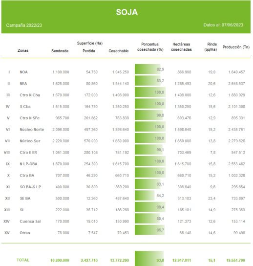 Continúan las labores sobre el norte de la región agrícola, donde el NOA ha cubierto al 82,9 % de la superficie apta con un rendimiento medio 19qq/Ha. Asimismo, el NEA ha avanzado sobre el 83,2 % con un rendimiento medio que se posiciona en 20,6 qq/Ha. Se ha finalizado la cosecha sobre Córdoba, Núcleo Sur, Norte de La Pampa- Oeste de Buenos Aires y Centro de Buenos Aires. El rendimiento promedio en el Núcleo Sur ha sido de 13,8 qq/Ha, lo cual representa una disminución del 57 % en comparación con la campaña anterior (Rendimiento Núcleo Sur 2021/22: 32,4 qq/Ha). Por otro lado, el rendimiento medio para el Norte de La Pampa -Oeste de Buenos Aires ha sido de 15,8 qq/Ha .