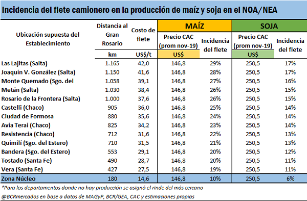1) El flete camionero sigue teniendo una alta incidencia en las distancias largas como en el norte argentino. Equivale a tres veces el costo de transporte de la zona núcleo de producción (a 180 Km de los puertos del Gran Rosario).