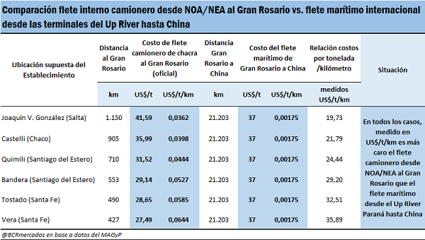 2) Sigue siendo más caro transportar el grano desde el norte argentino a las terminales portuarias del Gran Rosario, que enviarlos a los principales mercados mundiales.