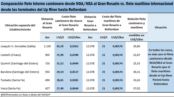 Si comparamos el flete camionero en nuestro país con el costo del transporte marítimo al puerto de Rotterdam, principal ingreso de los productos agrícolas al mercado europeo, encontramos que es más barato enviar la producción al viejo continente que a los puertos del Gran Rosario desde cualquier distancia superior a los 290 km. Recorrer en camión los 1.150 km que separan a Joaquín V. Gonzalez de los puertos del Up River cuesta casi el doble que el viaje en buque de más de 12 mil km hasta el principal puerto granelero de Europa (41 U$S/tn vs 21 U$S/tn).