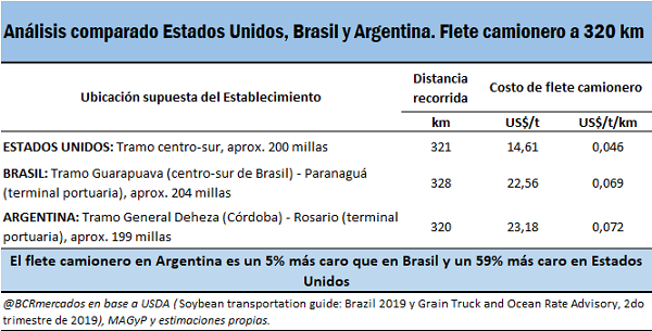 Para responder a esta pregunta, en primer lugar procedimos a comparar el costo del flete doméstico para una distancia recorrida de 320 km entre Argentina, Brasil y Estados Unidos. Luego comparamos la situación de un flete que recorre 1.150 km entre Argentina y Brasil, dado que no hay información disponible para Estados Unidos (en distancias largas el país del norte opta por alternativas de transporte menos onerosas, como ser el tren o la barcaza fluvial).