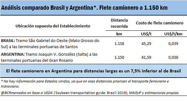 Como puede verse en el cuadro adjunto, medido en dólares por tonelada cargada por kilómetro recorrido para una distancia relativamente corta de 320 kilómetros (como la que separa un acopio en General Deheza, Córdoba, con una terminal portuaria en Rosario, Santa Fe) el costo del flete camionero argentino asciende a US$ 0,072/t/km. En Brasil, para un tramo equivalente, el costo resulta un 5,3% inferior al ubicarse en los US$ 0,069/t/km. En los últimos años esta diferencia se ha achicado ya que, para finales del 2016, el flete en Brasil tenía un valor de poco más de la mitad que para el caso argentino.