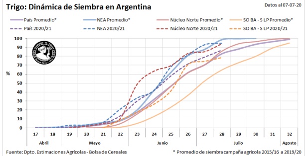 El progreso intersemanal de siembra marcó 7,7 puntos porcentuales, alcanzando a cubrir el 86,8 % del área proyectada en 6,5 MHa. La ausencia de lluvias ha permitido retomar las labores en Entre Ríos, Santa Fe y Centro de Buenos Aires, incrementando la intención de incorporar más área con el cereal. Similar situación se releva en el sudeste y sudoeste bonaerense, donde varios cuadros que se encontraban bajo condiciones de excesos hídricos comienzan a recuperar piso. Sin embargo, la ininterrumpida falta de precipitaciones compromete el área aún pendiente de siembra en las regiones NEA, Centro-Norte y Sur de Córdoba, Núcleos Norte y Núcleo Sur.
