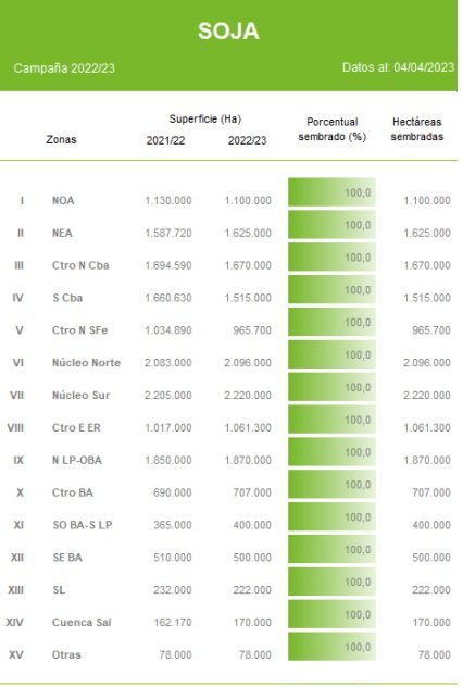 Luego de un avance intersemanal de 2,3 p.p., la cosecha de soja de primera cubre el 4 % de la superficie apta con los mayores avances reportados sobre ambos núcleos, el Centro-Norte de Córdoba y el Norte de La Pampa-Oeste de Buenos Aires. Los rendimientos cosechados en dichas regiones se mantienen por debajo a los inicialmente esperados como consecuencia de las altas temperaturas y la ausencia de precipitaciones registradas durante gran parte del ciclo del cultivo. Sobre el Núcleo Norte se informan rendimientos mínimos de 12 qq/Ha en localidades como Pujato y máximos de hasta 20 qq/Ha en Monte Buey. Sobre el Núcleo Sur, localidades como Chivilcoy reporta rindes mínimos cosechados de 7 qq/Ha y máximos de hasta 20 qq/Ha sobre Venado Tuerto.