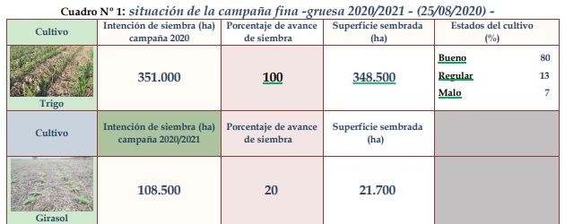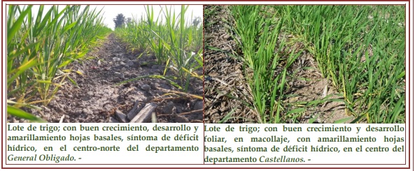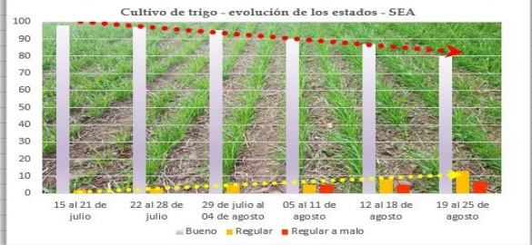 Con estabilidad climática, ambientes secos y temperaturas contrastantes, heladas, luego altos registros térmicos para la época del año, los cultivares continuaron su ciclo, presentándose hasta la fecha: • un 80 % de los trigales, con buen desarrollo en los diferentes lotes, así como en el inicio de su ciclo. Con buena respuesta a la fertilización y también buen estado sanitario, en el área de estudio. Aquí se concentraron, casi en su totalidad, las variedades de ciclos largos y más del 60 %, de las variedades de ciclos intermedios. • un 13 %, en estado regular, que con el transcurso de los días, ante la decreciente disponibilidad de agua útil, después de una buena germinación y emergencia, evidenciaron síntomas de déficit hídrico, observándose lotes no uniformes, en particular, lo sembrado en la segunda etapa, con trigos de ciclos intermedios y cortos. • el restante 7 %, se halló en estado regular a malo, con ciertos inconvenientes en los nacimientos y en los stands de plantas por unidad de superficie, coloración pálida, con sectores amarillentos en su área foliar, ubicándose geográfica y particularmente en los extremos suroeste y noroeste del SEA.