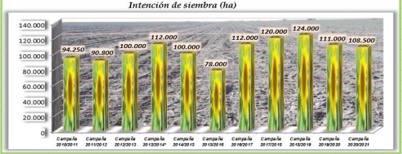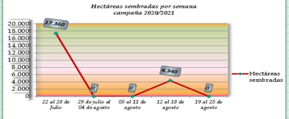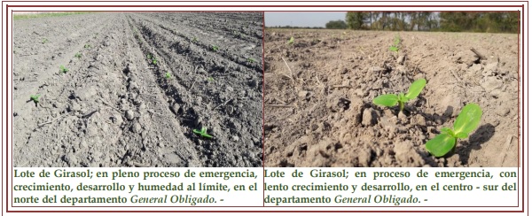 Proceso de siembra paralizado totalmente por las condiciones enunciadas en los sucesivos informes. Los lotes sembrados temprano, presentaron stand de plantas más uniformes, dado que la germinación y emergencia se dieron en mejores condiciones de humedad en la cama de siembra. El resto de los lotes, principalmente los sembrados más tarde, con escasa humedad, mostraron irregular proceso de germinación y emergencia. Hasta la fecha, se logró un avance del orden del 20 %, o sea, 21.700 ha, con referencia a la intención inicial, que se estimó sería similar a la campaña del año anterior, que alcanzó las 108.500 ha