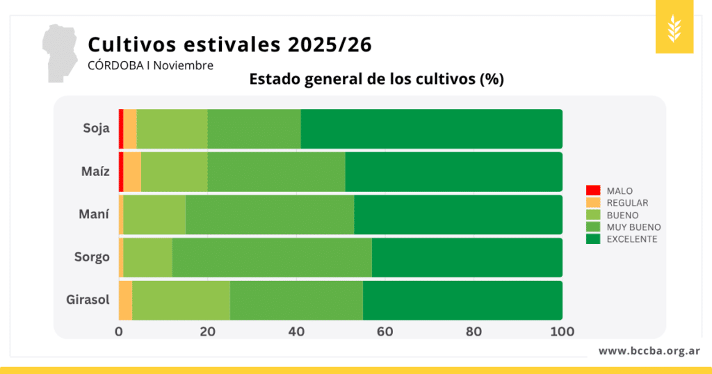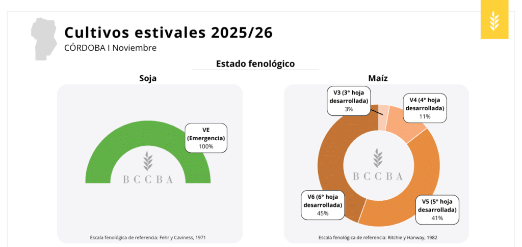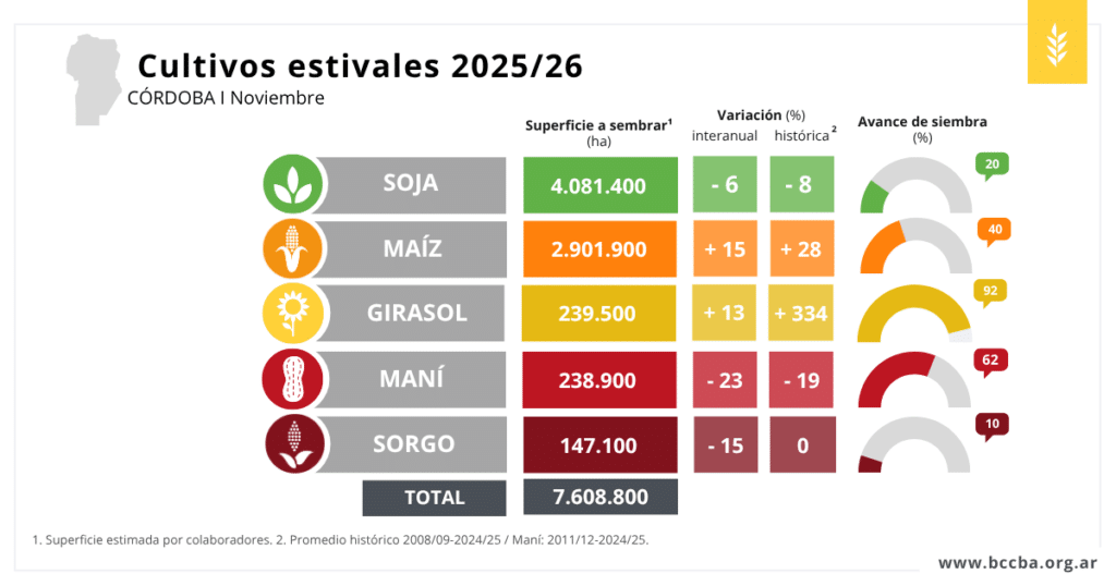 La siembra de cultivos estivales en Córdoba continúa avanzando, aunque marcada por una fuerte disparidad entre zonas y cultivos. Entre el 3 y el 9 de noviembre, el avance estuvo condicionado por la limitada oferta hídrica y un octubre con precipitaciones irregulares y temperaturas más bajas que lo habitual.