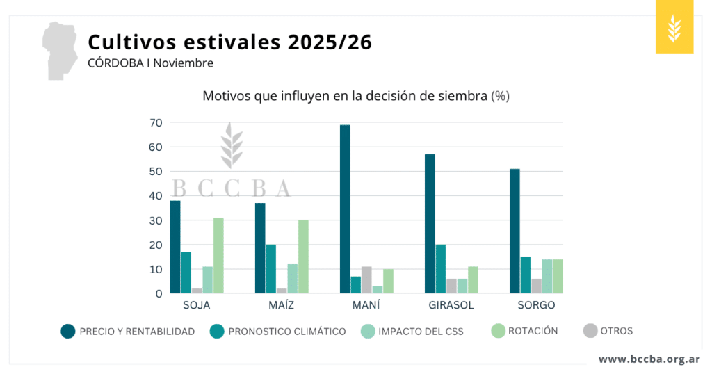 Las decisiones de siembra estuvieron fuertemente influenciadas por la relación precio–rentabilidad, factor clave para definir cada campaña. Para maíz, soja y maní, la rotación se ubicó como la segunda variable más influyente.