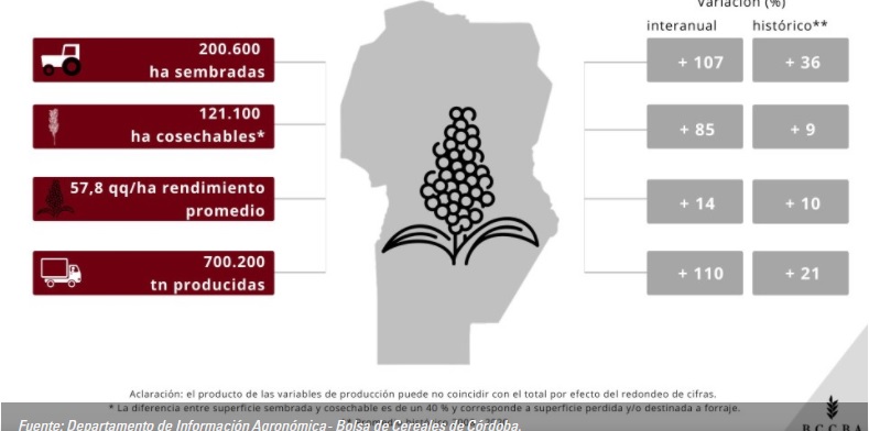 A nivel país, las variables del sorgo crecieron en un nivel similar, motivado por el aumento de precio del cereal y las condiciones climáticas esperadas. Aun así, la provincia de Córdoba mostró una leve mejora interanual en la participación tanto de la superficie sembrada como de la producción total.