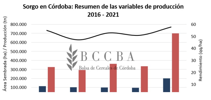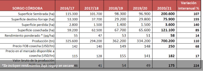 En la campaña 2020/21 ocurrió un enorme salto en la producción de sorgo, que alcanzó 700.200 toneladas y duplicó el volumen de la campaña pasada, superando en un 21 % al promedio histórico (2008-2020). Este incremento se debió principalmente al crecimiento de la superficie sembrada, que superó las 200.000 hectáreas y fue motivado principalmente por el aumento del precio del cereal. De acuerdo con el testimonio de la Red de Colaboradores, el área sembrada podría haber sido incluso mayor, pero se vio limitada por la disponibilidad de semilla.
