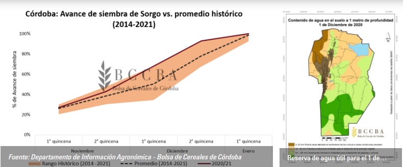 A inicios de octubre el contenido de agua en el suelo a 1 metro de profundidad evidenciaba un perfil de humedad escaso para las siembras tempranas, motivo por el cual gran parte de los productores de Córdoba decidió ir hacia siembras tardías. En el caso particular del sorgo, se siembra siempre en épocas tardías por lo que las labores pudieron realizarse sin inconvenientes.