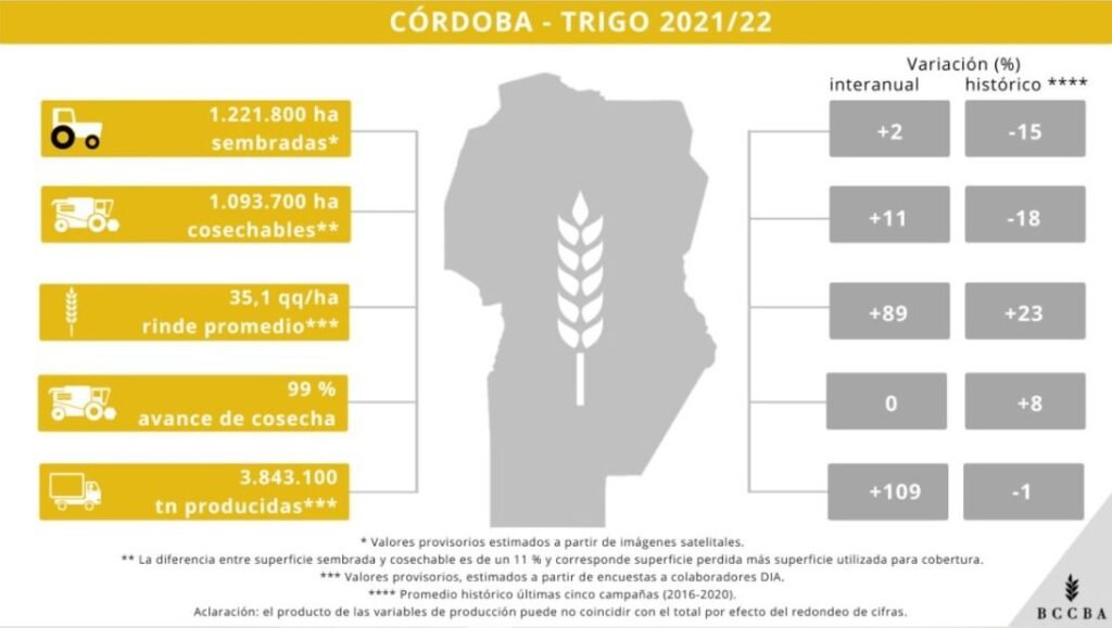 Trigo: Finalizando el mes de diciembre el avance de cosecha ya era muy cercano al 100 %. El rendimiento promedio provincial se estima en 35,1 qq/ha y la producción rondaría las 3,8 millones de tn.