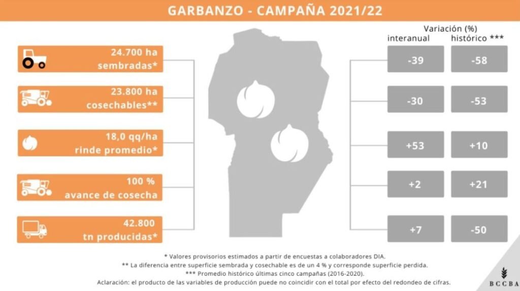 Garbanzo: Con el 100 % del área cosechada, el rendimiento promedio para la provincia rondaría en 18,0 qq/ha, con una producción que superaría las 42 mil toneladas.