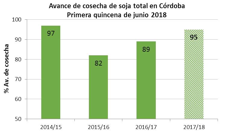 El avance de cosecha ponderado a nivel provincial es del 95%, similar a una campaña normal para Córdoba, como lo fue la 2014/15, restando de trillar en la provincia unas 183.500 has.