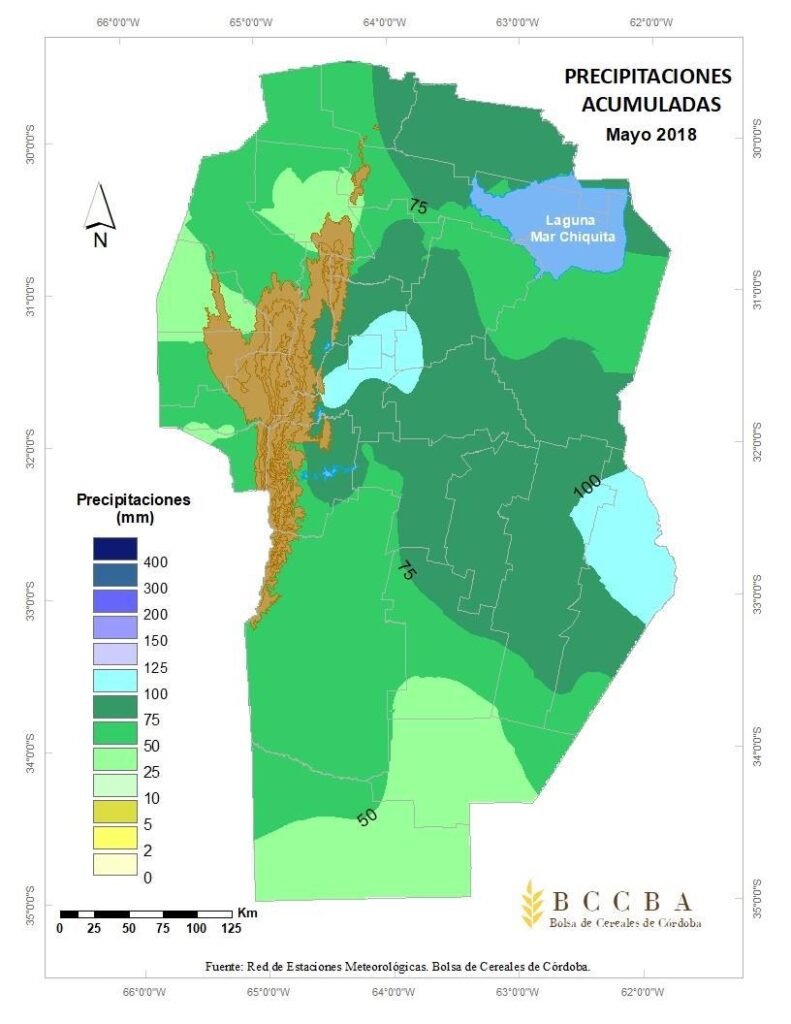 Las precipitaciones acontecidas durante el mes de mayo fueron un 50% superior, excepto la zona sur que estuvo en un 25% superior, respecto a lo normal en la provincia de Córdoba.