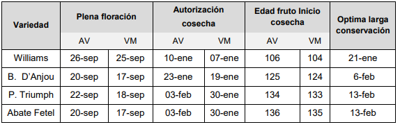 Tabla 1. Fechas de plena floración, autorización de cosecha, edad del fruto y óptima para larga conservación de las principales variedades de pera de la región. Temporada 2018- 2019.