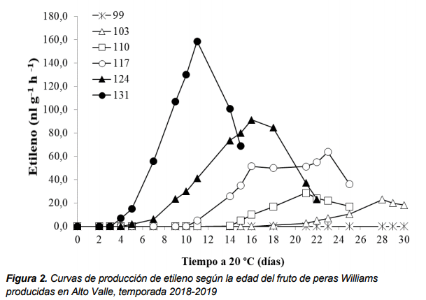 El análisis de las curvas de etileno desde la temporada 2008 en adelante ha permitido establecer patrones típicos de producción de etileno, asociados a distintos estados de madurez de los frutos. El periodo de demora y el tiempo necesario para alcanzar el pico climatérico disminuyen de forma significativa en la medida que avanza la edad de fruto, como indicativo del avance de la madurez. En pera Williams se caracterizaron 4 estados de madurez distintos durante el periodo de cosecha de acuerdo con el patrón de producción de etileno, con efecto en el desarrollo de la maduración y su comportamiento de poscosecha.