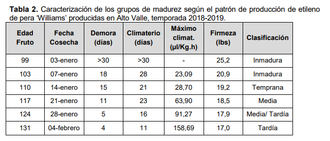 El Grupo inmaduro representa las cosechas de fruta anterior al “sello de cosecha”. Los frutos tienen una producción de etileno retrasada (>30 días) y presentan procesos de maduración desacoplados o deficientes, indicadores de que no han alcanzado la madurez mínima de cosecha, con un deficiente comportamiento de poscosecha. El Grupo de madurez “temprana” está definido por un periodo corto durante la cosecha (99-105 días de edad del fruto), coincidente con el “sello de cosecha” de la variedad. La fruta alcanzó el estado de madurez que permitiría la evolución satisfactoria de las características organolépticas, y se caracteriza por una producción de etileno a partir de los 12-20 días, y un pico climatérico entre los 20-24 días, y valores de firmeza entre 18 y 22 libras. El Grupo medio es el grupo más amplio, que abarca la fruta cosechada entre los 106 y 121 días de edad de fruto, periodo que corresponde a la “ventana de cosecha” óptima para la pera Williams en la región. La demora de producción de etileno es de 8-14 días, con picos climatéricos entre los 15-19 días y valores de firmeza de pulpa muy variables, de 16 a 20 libras. Este grupo, junto con el siguiente, es el que presenta el mejor desarrollo organoléptico (evaluaciones visuales, subjetivas). El Grupo tardío representa la madurez avanzada de la fruta, fuera del periodo óptimo de cosecha para la región, asociada a un bajo potencial de conservación. Estos frutos de cosechas tardías tienen una edad de fruto superior a los 123 días, demoras en la producción de etileno entre 3-10 días, con picos entre 8-14 días y firmezas menores a 17 libras.