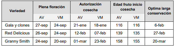Tabla 2. Fechas de plena floración, autorización de cosecha, edad del fruto y óptima para larga conservación de las principales variedades de manzanas de la región. Temporada 2018-2019