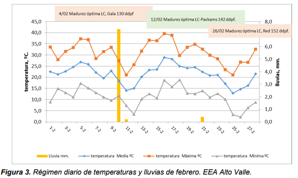 En la presente temporada las condiciones térmicas fueron desfavorables durante la división celular y las primeras etapas del engrosamiento celular. Además, en ese momento se consumió gran parte de las reservas invernales, por lo que el llenado de los frutos dependió mucho del balance fotosintético de las primeras hojas (https://inta.gob.ar/documentos/frutales-ciclo-productivo-2018-2019). Esta situación provocó un retraso generalizado del inicio de cosecha por bajos calibres. En las primeras cosechas se observó una mayor incidencia de daños mecánicos relacionados a la sensibilidad de la piel de los frutos a los roces y fricciones, debido a las condiciones climáticas particulares de las primeras semanas de enero (Figura 1), con altas temperaturas, mayor deshidratación y cierto grado de inmadurez de los frutos. Esta situación fue mejorando gradualmente con el avance de la maduración de los frutos en las semanas siguientes