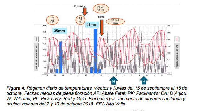 Características climáticas generales de la temporada El momento y las condiciones climáticas en las que se desarrolla la floración y posteriormente el cuaje de los frutos determinan su crecimiento y desarrollo. Para que estos procesos se desarrollen normalmente es necesaria una acumulación de horas de frio y una posterior acumulación de horas de calor. La temporada 2018-2019 se caracterizó por tener una óptima acumulación de horas de frío. Para los frutales de pepita, las condiciones de acumulación de horas de calor fueron normales, aunque en algunas variedades y en ciertos lugares hubo pequeños retrasos debido a la presencia de lluvias. Por lo tanto, la temporada se inició con fechas de plena floración normales para la zona. La fecha de plena floración resulta muy importante para determinar la edad del fruto y la fecha tentativa de cosecha. Esto es particularmente importante en las variedades de ciclo corto, como por ejemplo la pera Williams. Durante el mes de diciembre se registraron temperaturas medias del aire 2 °C inferiores a lo normal. Esta situación podría haber condicionado la tasa de maduración de los frutos, lo cual originó un retraso en alcanzar la madurez fisiológica al momento de la fecha de cosecha tentativa (https://inta.gob.ar/documentos/frutales-ciclo-productivo-2018- 2019).
