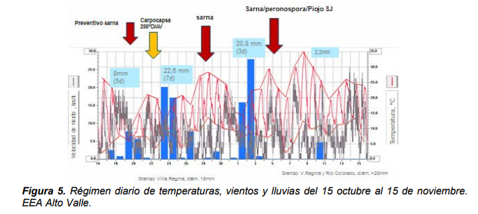En esta temporada se presentaron condiciones climáticas que favorecieron el desarrollo de corazón mohoso, fundamentalmente las precipitaciones ocurridas durante floración y cuaje (Figuras 4 y 5). Debido a ello, al momento de la cosecha se observó una mayor incidencia y mayores grados de avance de esta enfermedad. Durante el período de cosecha se recomendó evaluar la incidencia y la severidad de cada lote, para definir su conservación. Esta enfermedad puede agravarse durante el almacenamiento, favorecida por índices de madurez más avanzados o fechas de cosecha tardías. Esto es particularmente importante en el caso de corazón mohoso húmedo, ya que su desarrollo es más rápido. Por ello se recomienda monitorear el avance de la enfermedad durante la conservación, para definir el período de conservación de cada lote (https://inta.gob.ar/sites/default/files/inta_corazon_mohoso_a4.pdf).