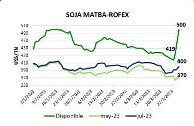 El precio disponible de soja, publicado por MATBA-ROFEX, avanzó las últimas tres jornadas de la semana pasada. Ultima semana de marzo 23, desde U$S 419 a 500/TN, en PESOS pasó de $87.000 a 105.000/TN, mientras el futuro mayo 23 cerró a U$S 400/TN. La muestra cabal de precios distorsionados es esta, donde, a un Dólar agro de $300/U$S, el precio de U$S 370/TN, valor de cierre del futuro mayo 23 el pasado viernes 31 de marzo, equivale a $111.000/TN, por encima de $105.000/TN ofrecidos el viernes pasado por el disponible MATBA-ROFEX, salto de precios que muestra el gráfico. La diferencia entonces entre el precio disponible y el mayo 23 en Dólares, U$S -130/TN, refleja el Dólar agro por llegar. Mientras tanto, el SIO granos registró operaciones en el mercado disponible entre $85.000 y 88.000/TN la última semana de marzo 23, ampliando el diferencial entre el mercado físico y el MATBA-ROFEX.