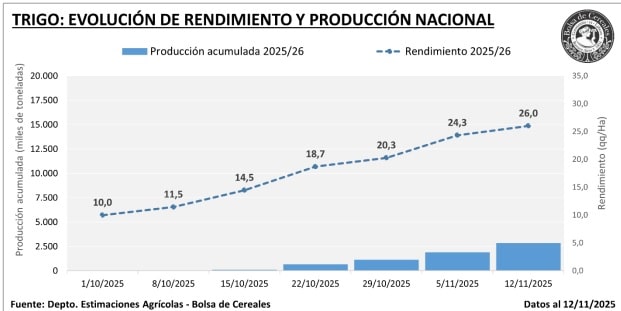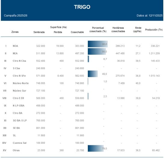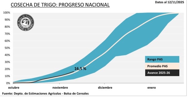 La campaña de trigo 2025/26 empieza a mostrar números que ya la ubican entre las mejores de la historia. Con un avance intersemanal de 4,9 puntos, la cosecha cubre el 16,5% del área apta a nivel nacional y consolida rindes muy por encima de lo habitual.