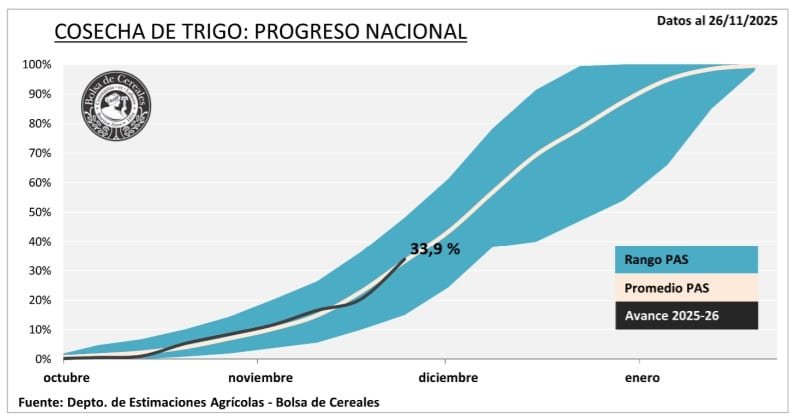 La cosecha de trigo ya cubre el 33,9% del área apta y avanza a un ritmo similar al promedio histórico. Mejores rendimientos de lo previsto y un menor impacto de las heladas permiten elevar la proyección nacional a 25,5 MTn, un 13,8% por encima del récord previo de la campaña 2021/22.