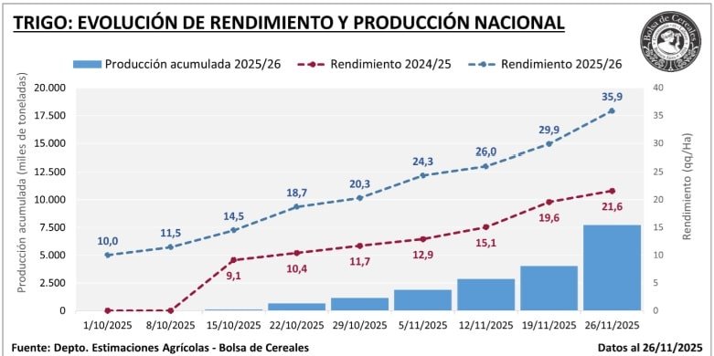 Uno de los aspectos más destacados es el comportamiento de los rindes. Los valores registrados hasta el momento superan las expectativas previas, ubicándose en un promedio nacional de 35,9 qq/ha, un incremento significativo respecto a las proyecciones anteriores. Esta mejora responde, en parte, a que el impacto de las heladas tardías de fines de octubre resultó mucho menor al previsto.