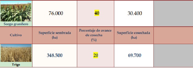 Las condiciones climáticas estables de la semana, el aumento de las temperaturas medias diarias, los días soleados, los vientos de dirección norte con ambientes secos, fueron las características que permitieron el avance y el desarrollo de los trigales. Ante lo cual, se observó un mayor movimiento de equipos y cosechadoras, reflejando así, un incremento en el ritmo del proceso de recolección, particularmente en los departamentos del norte y centro del SEA, como departamento General Obligado, Vera, Nueve de Julio, noroeste de San Javier, San Justo y norte de Las Colonias, Castellanos y San Cristóbal. Alcanzando, hasta la fecha un grado de avance del orden del 20 %, representando aproximadamente unas 69.700 ha. El trigo llegó a la cosecha, atravesando en su ciclo un déficit hídrico muy importante, que repercutió en las diferentes etapas fenológicas, observándose distintos indicadores que fueron enunciados en la secuencia de los informes semanales y reflejados en el siguiente cuadro, donde se representó la evolución de los estados, cuantificación (porcentajes) y fechas.