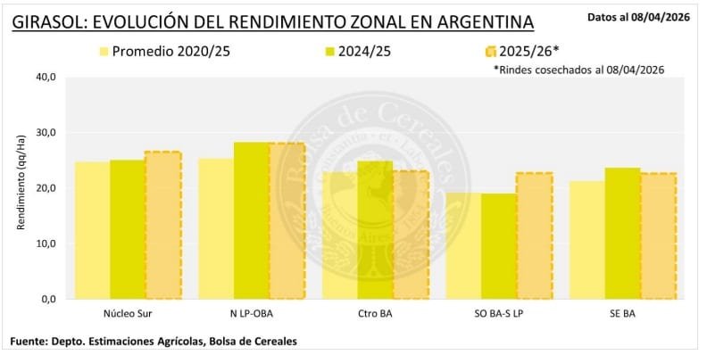 En cuanto a los rindes, el comportamiento es dispar según la región. Mientras que el oeste y sudoeste agrícola mantienen resultados similares o incluso superiores al ciclo previo, el centro y sudeste bonaerense registran valores iguales o por debajo del año pasado, aunque todavía por encima del promedio del último quinquenio.