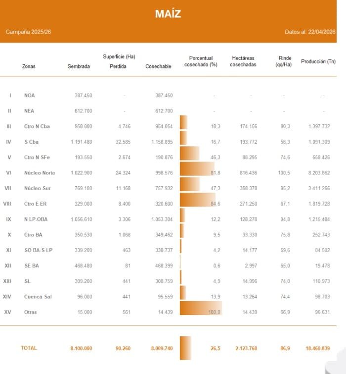 La cosecha de maíz continúa su avance en Argentina y ya cubre el 26,5% del área apta a nivel nacional, con un rinde promedio de 86,9 quintales por hectárea.