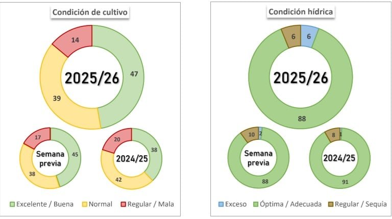 Esta recuperación se explica por una mejor disponibilidad de humedad en los perfiles, tras las recientes precipitaciones, lo que fortalece las expectativas productivas en etapas críticas del cultivo.
