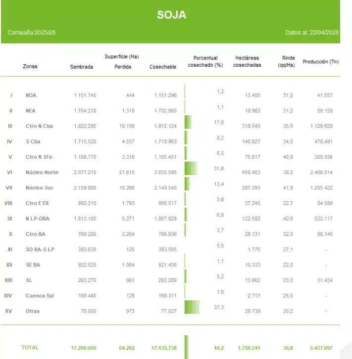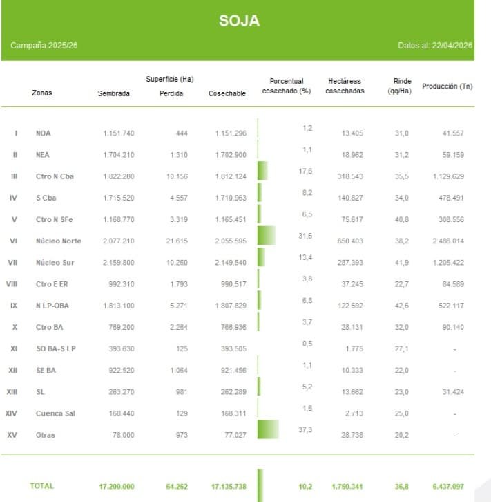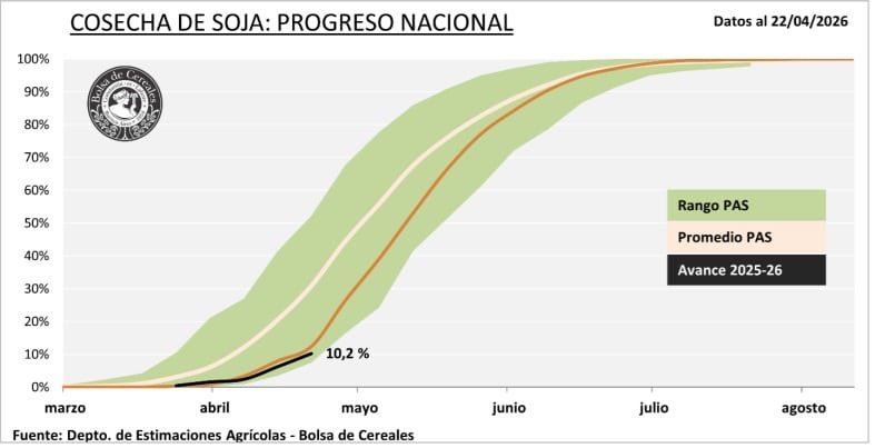 La cosecha de soja en Argentina comienza a tomar ritmo, aunque todavía con fuertes condicionantes climáticos. En la última semana, el avance nacional alcanzó el 10,2% de la superficie apta, tras registrar un progreso intersemanal de 4 puntos porcentuales.