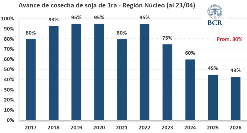 El avance está muy por debajo del ritmo normal (debería rondar el 80%) y marca el mayor atraso en 10 años. Excesos hídricos, granos húmedos y deterioro en lotes ya impactan en el valor comercial.