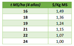 Costo por kg de materia seca totales (producido en 4 años promedio con rendimientos que van de los 6 a 10 tn/ms/año) incluido el costo de mantenimiento anual, para distintos niveles de producción.