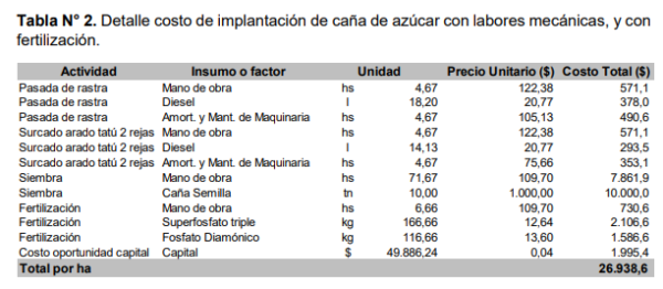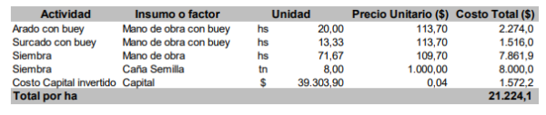El costo de la plantación de caña de azúcar con labores manuales se presenta en la tabla 1, alcanzando un valor de $ 21 mil. Al ser una actividad netamente manual, la mano de obra representa el 55% del costo y la caña semilla el 38%. Agrupado por actividad, surge que la preparación del suelo representa el 18% del costo y la siembra el 75%. Tabla N° 1. Detalle del costo de implantación de caña de azúcar en forma manual sin fertilización.