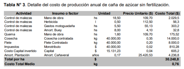En el sistema mecanizado, el costo de prepararción del suelo es menor que en el manual, con una diferencia de $1.132. En tanto que la siembra se encarece en $ 2.000 por usar 2 t más de caña semilla y se agregan los costos adicionales de la fertilización de $4.423. En general, si bien el sistema mecanizado tiene un costo de $5.714 más que el manual, se podría compensar con los mayores rendimientos esperados. En lo que respecta al costo de la producción anual, también hay dos modelos de producción, uno sin fertilización y otro con fertilización. En el caso del costo sin fertilización, la producción de 40 t genera un costo de $ 30 mil (tabla 3), lo que representa $0,76 por kg de caña de azúcar. De los datos surge que el 25% del costo total es fijo y el 75% restante variable (cosecha, flete y la amortización de la plantación).