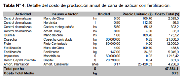 En el caso de un modelo de producción con fertilización y con mayores rendimientos (tabla 4) el costo total de producción es de $ 47 mil ($0,79 por kg de caña). Si se considera la fertilización, la cosecha y flete como costos variables, los mismos representan el 82% del total. La fertilización y los mayores rendimientos generan mayores costos de cosecha y flete. El modelo con fertilización tiene los costos más elevados, pero son diluidos con los mayores rendimientos que se obtienen, logrando una reducción del costo total medio por kg de caña de azúcar.