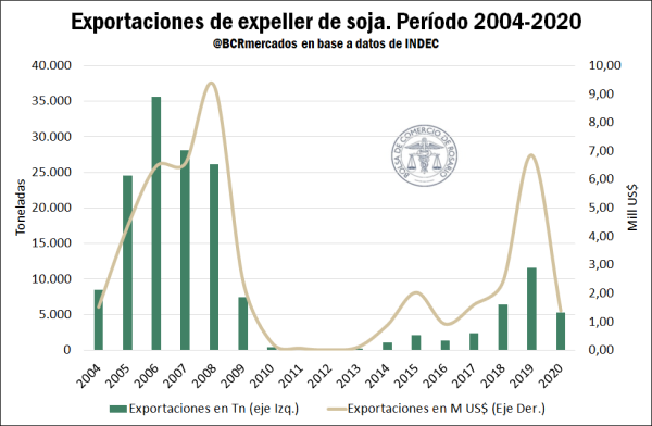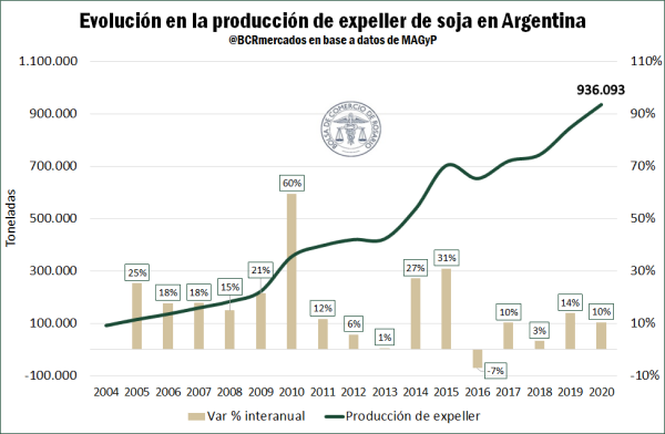 Si se observa la evolución en la producción de expeller de soja ha presentado un crecimiento casi ininterrumpido desde 2004 hacia adelante, presentando solamente una caída en la producción en el año 2016. Según los datos provistos por el Ministerio de Agricultura, Ganadería y Pesca (MAGyP), en el año 2004 la producción total alcanzaba 91.855 toneladas, mientras que en 2011 luego de un período de tasas de crecimiento anuales promedio del 24%, el producto total se ubicó en un valor cercano a 400.000 toneladas. A partir de allí se comenzó a registrar un ritmo de crecimiento menos uniforme y a tasas más bajas, aunque más que duplicando la producción hasta 936 mil toneladas procesadas en el año 2020.
