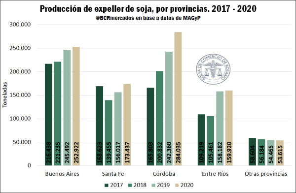 Respecto a la evolución de la producción provincial en los últimos años, la provincia de Córdoba destaca como la jurisdicción con mayor dinamismo con un crecimiento en la producción de expeller de soja del 71% entre el año 2020 y 2017. Seguida por Entre Ríos, que alcanzó un incremento productivo para el período del 46%, mientras que Buenos Aires y Santa Fe han presentado tasas menores del 17% y 3% respectivamente.