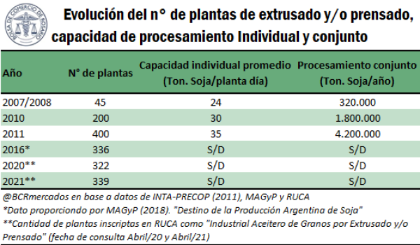 Según las estimaciones de INTA-PRECOP (2011), entre 2007/2008 y 2011, hubo un crecimiento sostenido en la cantidad de plantas industriales de extrusado-prensado de soja alcanzando los 400 establecimientos, según el último dato proporcionado por dicho organismo. En cuanto a la capacidad productiva, se advierte un crecimiento del 45% en el procesamiento individual promedio desde 2007/2008, ubicándose en las 35 toneladas diarias para el año 2011. Por lo cual, dicho estudio arriba a la conclusión de que existe un potencial de procesamiento conjunto cercano a las 4,2 millones de toneladas de soja por parte del sector.