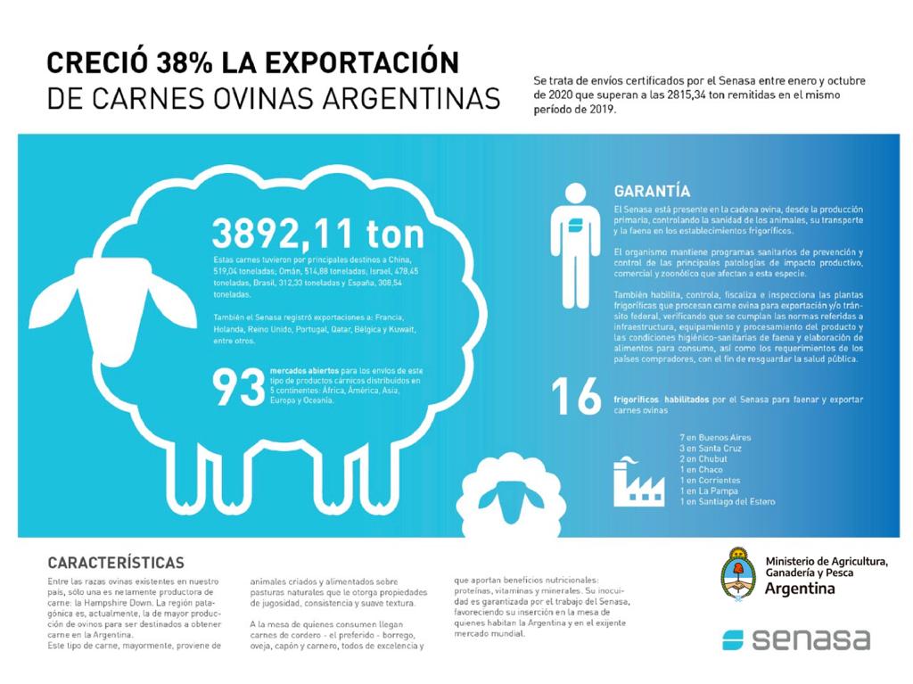 El Ministerio de Agricultura, Ganadería y Pesca, informa que entre enero y octubre de 2020, el Servicio Nacional de Sanidad y Calidad Agroalimentaria (Senasa) certificó la exportación de 3892,11 toneladas de carne ovina, un 38 por ciento más con respecto al mismo periodo del año pasado en que se enviaron 2815,34 toneladas.