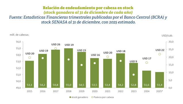 Para dimensionarlo: a diciembre de 2025, el valor estimado de la hacienda en stock rondaba USD 53.500 millones, mientras que la deuda bancaria totalizaba USD 1.133 millones. En la agricultura, en cambio, el crédito suele superar el 10% del valor de la producción, marcando una brecha estructural entre ambos sectores.