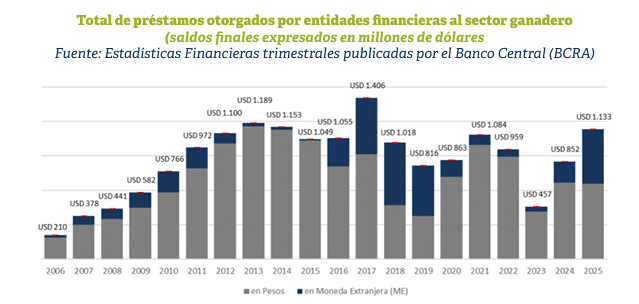El financiamiento ganadero vuelve a ganar volumen y cambia de perfil. Al cierre de 2025, los préstamos bancarios tomados por empresas dedicadas a la cría de ganado bovino alcanzaron USD 1.133 millones, el segundo nivel más alto de los últimos 20 años, impulsados por un fuerte crecimiento del crédito en moneda extranjera.