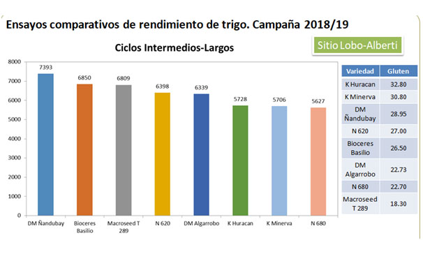 Además, se recolectaron los datos de ensayos trigo. De acuerdo a la información generada por Ignacio Suiffet, se vieron variedades interesantes en su comportamiento respecto al testigo (DM Algarrobo) que buscando alternativas en genética de trigo para incorporar a los planteos de ciclos intermedios largos.