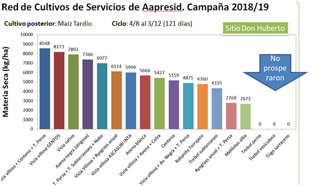 Dentro de la Chacra funciona la Red de Cultivos de Servicios de Aapresid, la cual fue evaluada en su campaña 2017/18, en el Sitio don Humberto y la información fue generada por los socios Aapresid Bernardo Romano y Mauricio Battafarano.