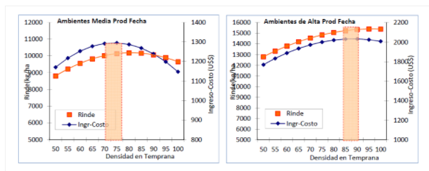 Los valores de densidad óptima económica en planteos de fecha de siembra tardía presentan un rango más acotado (mínimos más altos y máximos más bajos) y los valores de densidad óptima económica quedaron definidos en 63.000, 68.000 y 75.000 plantas/ha para ambientes de baja, media y alta productividad.